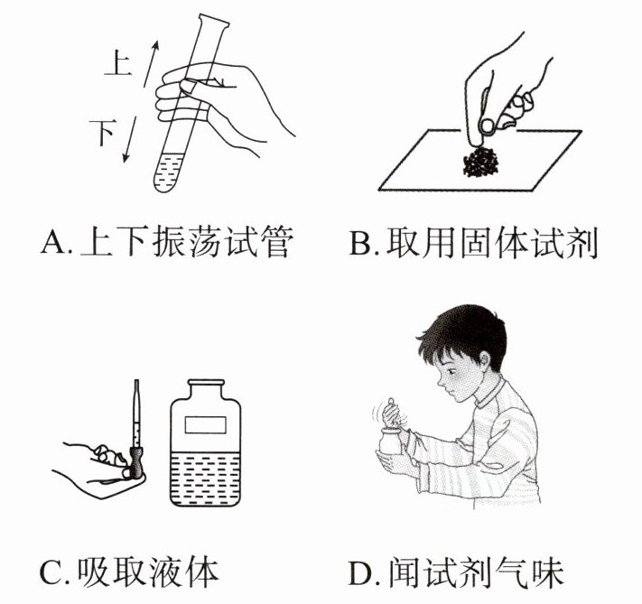 9.D 解析:不能上下振荡试管,容易使液体溅出;取用固体试剂要用镊子或药匙;吸取液体后的胶头滴管不能倒持。