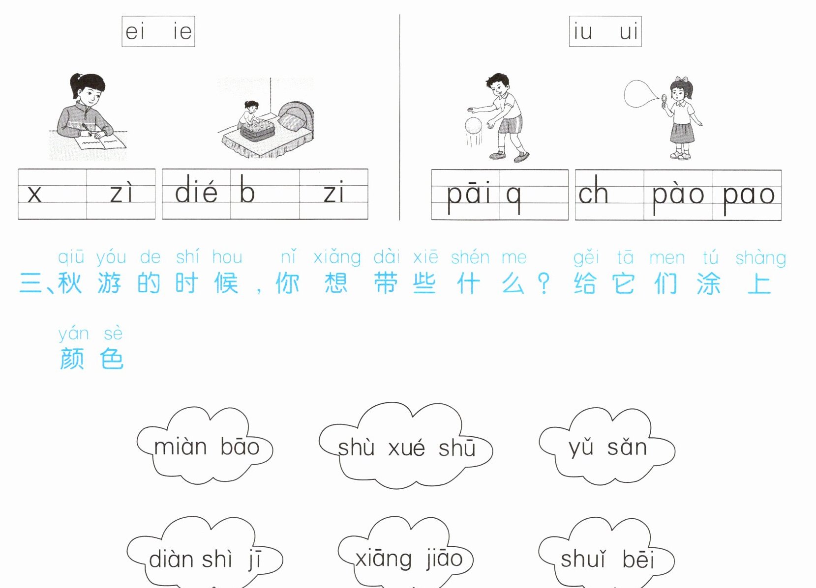 1. 想带的东西:miàn bāo(面包,涂颜色)、shū(书,涂颜色)、yǔ sǎn(雨伞,涂颜色)、shuǐ bēi(水杯,涂颜色)。