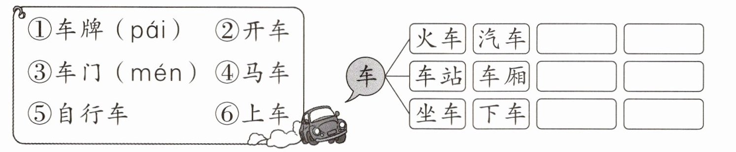 ①车牌(pái) ②开车 ③车门(mén) ④马车 ⑤自行车 ⑥上车