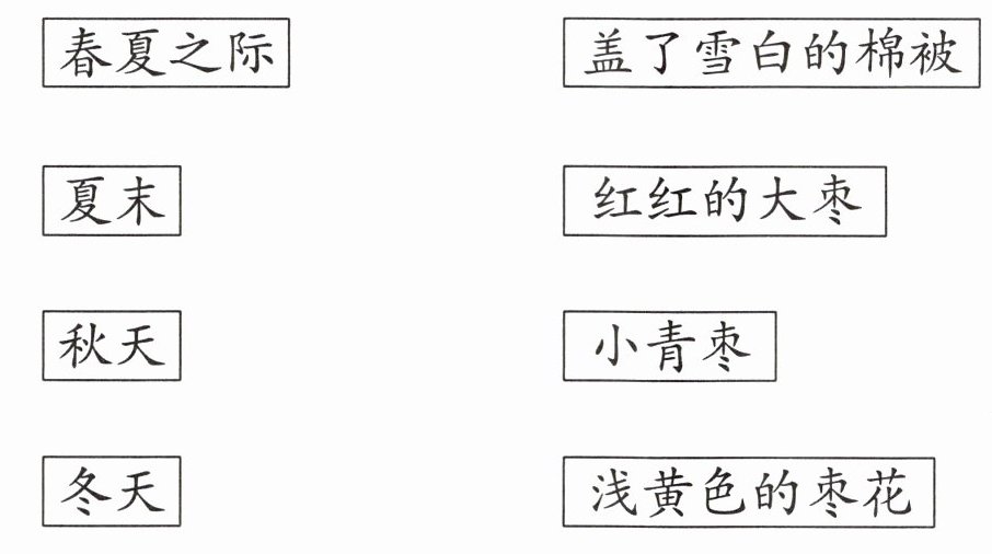1. 3 2. ③ 3. 春夏之际 盖了雪白的棉被 夏末 红红的大枣 秋天 小青枣 冬天 浅黄色的枣花