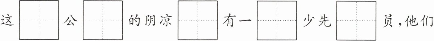这$\begin{array}{|c|}\hline\mathrm{z}\mathrm{u}\mathrm{ò}\\\hline\end{array}\\\hline 公\begin{array}{|c|}\hline\mathrm{y}\mathrm{u}\mathrm{á}\mathrm{n}\\\hline\end{array}\\\hline 的阴凉\begin{array}{|c|}\hline\mathrm{c}\mathrm{h}\mathrm{ù}\\\hline\end{array}\\\hline 有一\begin{array}{|c|}\hline\mathrm{q}\mathrm{ú}\mathrm{n}\\\hline\end{array}\\\hline 少先\begin{array}{|c|}\hline\mathrm{d}\mathrm{u}\mathrm{ì}\\\hline\end{array}\\\hline $员,他们正在练习吹铜号呢。