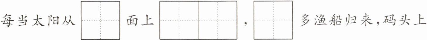 每当太阳从$\begin{array}{|c|}\hline hǎi \\ \hline \end{array}\\ \hline 面上\begin{array}{|c|c|}\hline shēng & qǐ \\ \hline \end{array}\\ \hline $,$\begin{array}{|c|}\hline xǔ \\ \hline \end{array}\\ \hline $多渔船归来,码头上变得热闹起来。