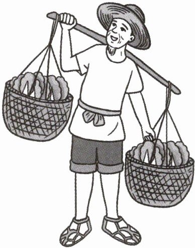 夏日的早晨,爷爷( )着草帽,( )着草鞋,( )起箩筐,准备去集市上卖菜。