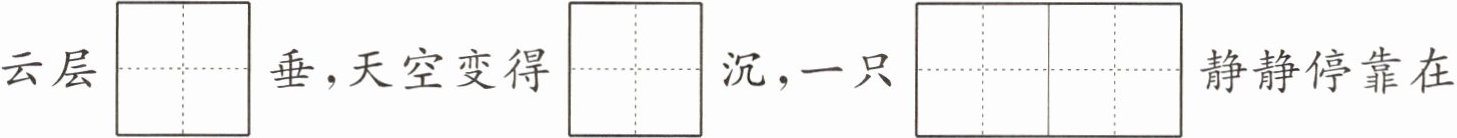 云层$\begin{array}{|c|c|}\hline dī & \\\hline\end{array}\\\hline $垂,天空变得$\begin{array}{|c|c|}\hline yīn & \\\hline\end{array}\\\hline $沉,一只$\begin{array}{|c|c|c|}\hline xiǎo & zhōu & \\\hline\end{array}\\\hline $静静停靠在岸边。
