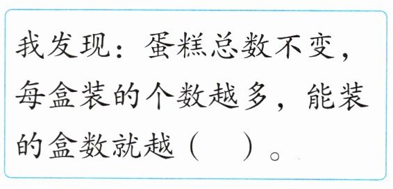 我发现:蛋糕总数不变,每盒装的个数越多,能装的盒数就越()。