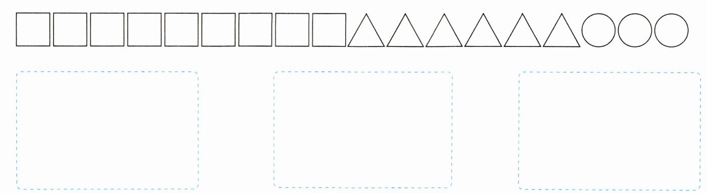把下面的图形平均分到 3 个方框里,每个方框能分到()个$◯$,()个$\triangle$,()个$□$。