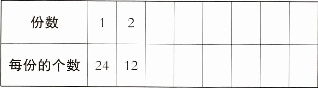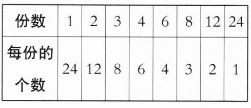 6. 平均分 24 个苹果,可以怎样分?在表格中写出所有情况。