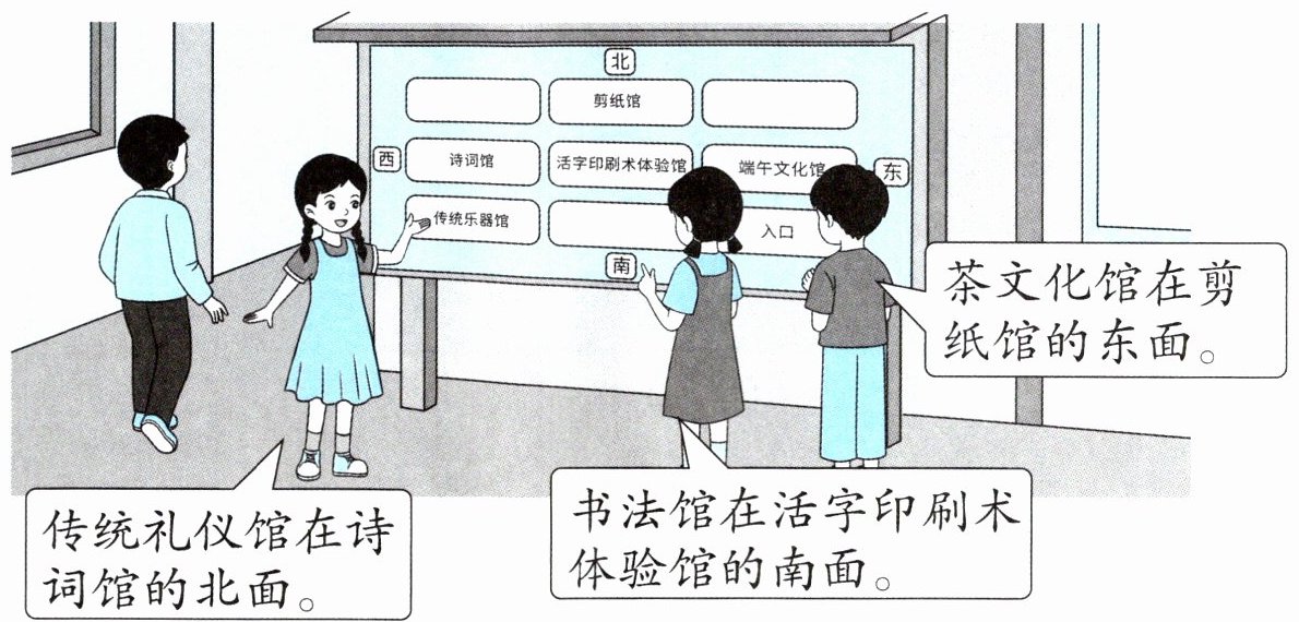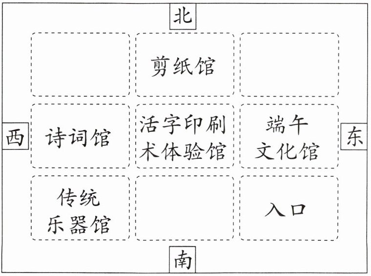 4.体育馆中设置了书法馆、剪纸馆、活字印刷术体验馆等若干个场馆。你能将此次活动的地图补充完整吗?看图填一填。