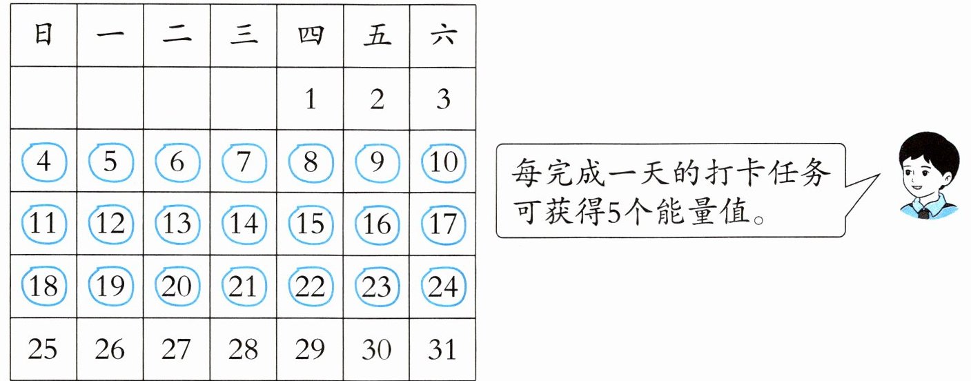 4. 小亮报名了假期跑步打卡活动,下面月历中圈出的是他跑步打卡的日期。