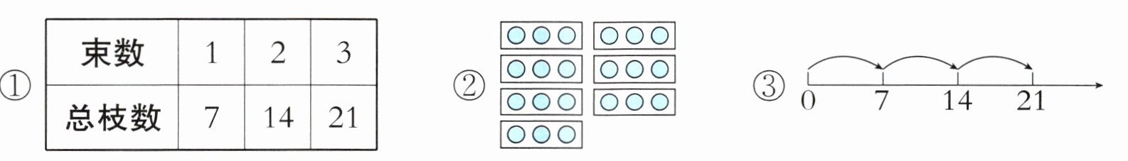 (1)小芳买了 3 束鲜花,每束 7 枝,一共有多少枝?下面的思考过程错误的是()。