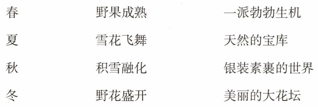 春—积雪融化—一派勃勃生机;夏—野花盛开—美丽的大花坛;秋—野果成熟—天然的宝库;冬—雪花飞舞—银装素裹的世界