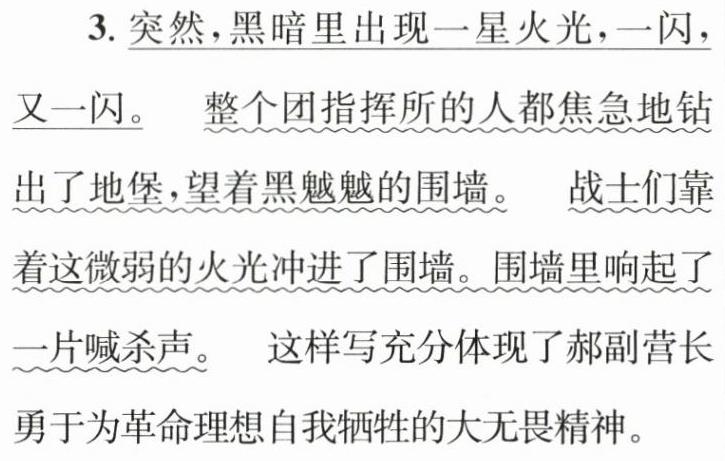 ③后来才知道,在这千钧一发的时刻,是郝副营长划着了火柴,点燃了那本书,举得高高的,为后续部队照亮了前进的路。可是,火光暴露了他自己,他被敌人的机枪打中了。