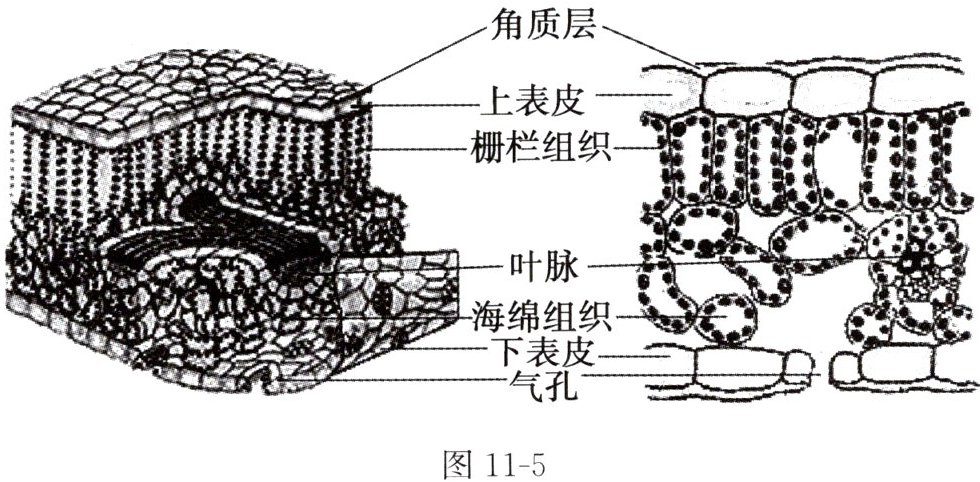 切片(图 11 - 2,图 11 - 3,图 11 - 4)。2. 观察叶的结构(图 11 - 5)。