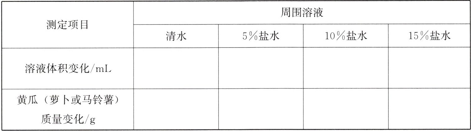 黄瓜(萝卜或马铃薯)、小菜板、菜刀、天平、砝码、500 mL 量筒、烧杯(4 个)、吸水纸、清水、质量分数为 20%的食盐水等。