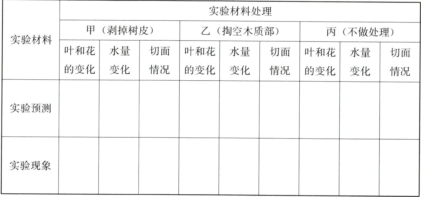 ,乙掏空木质部,丙不做任何处理,分别放在盛有稀释红墨水的锥形瓶中。将锥形瓶放在温暖、光照充足的地方3h。2. 注意观察叶和花的变化以及锥形瓶中水量的变化,并记录在下表中。