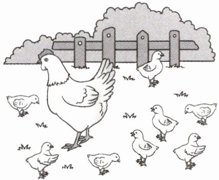 草地上有( )只母鸡,( )只小鸡。一共有( )只鸡。