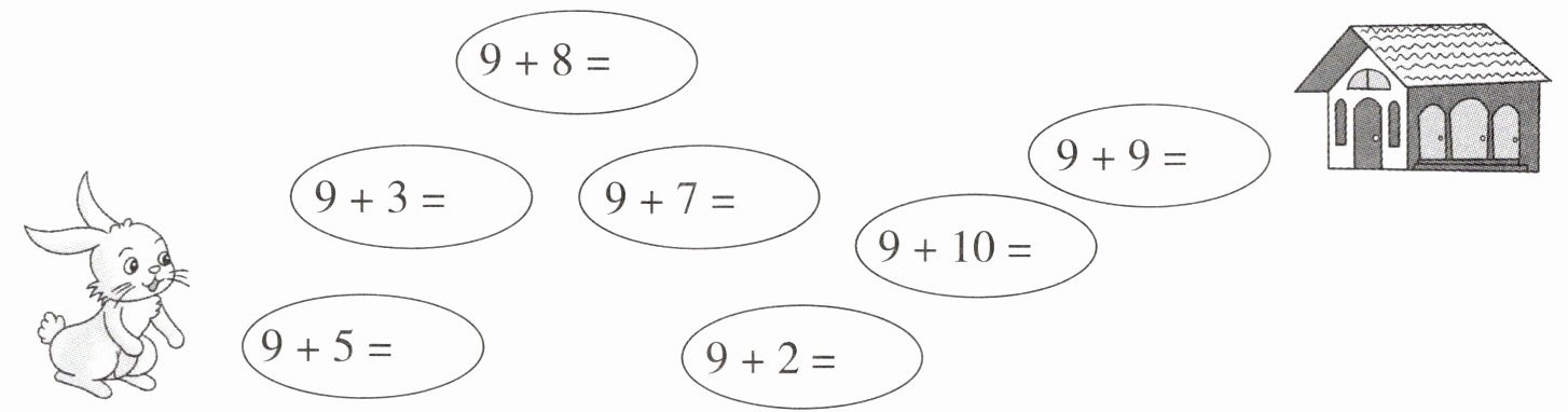 $ \begin{matrix} & & 9 + 8 = \\ & & \\ 9 + 3 = & & 9 + 7 = \\ & & \\ 9 + 5 = & & 9 + 2 = \\ & & \\ & & 9 + 9 = \\ & & \\ & & 9 + 10 = \\ & & \end{matrix} \\ & & $