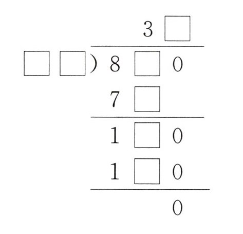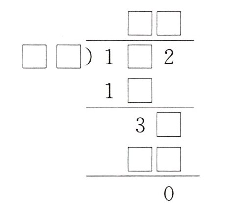 $\begin{array}{r}□□\\□□\enclose{longdiv}{1□2}\\\underline{1□}\\\ 3□\\\underline{□□}\\0\end{array}$ $\begin{array}{r}3□\\□□\enclose{longdiv}{8□0}\\\underline{7□}\\1□0\\\underline{1□0}\\0\end{array}$