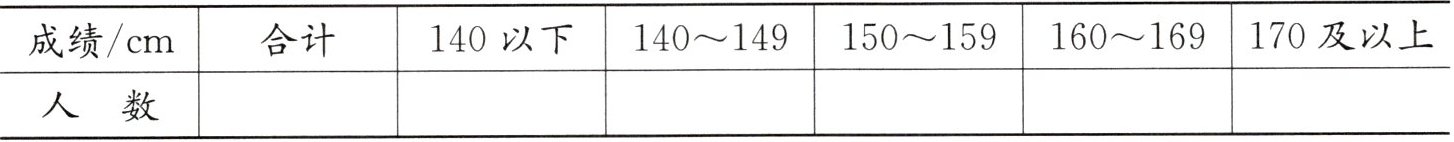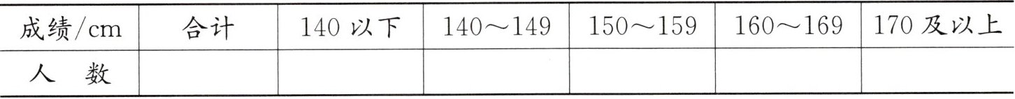 |成绩/cm|合计|140 以下|140~149|150~159|160~169|170 及以上|