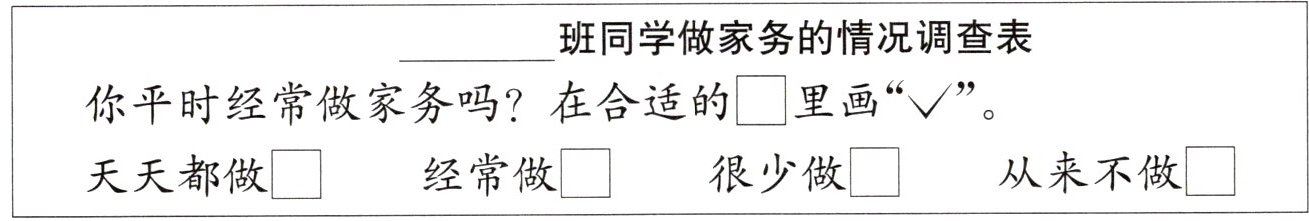 2. 你平时经常做家务吗?其他同学呢?先用下面的调查表进行调查,再整理调查数据,并完成统计表。
