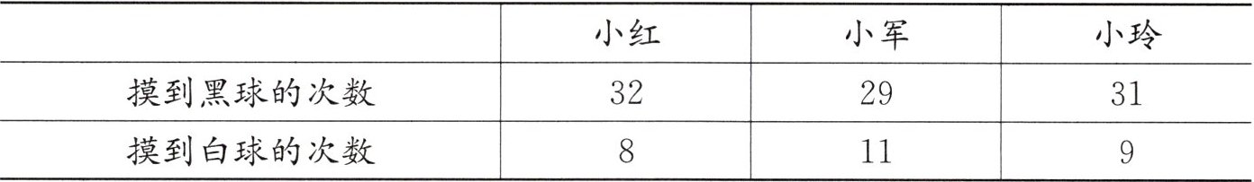 3. 小红、小军和小玲三人做摸球游戏,都从同一个口袋里摸球,各摸40次。下面是三人的摸球记录。
