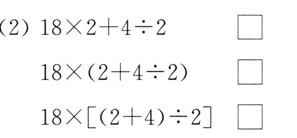 (1) $55 + 12×4 + 26$ $□$ (2) $18×2 + 4÷2$ $□$