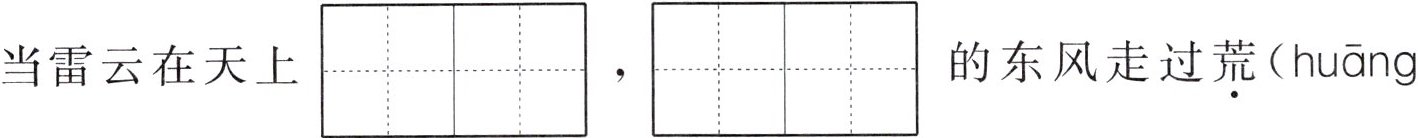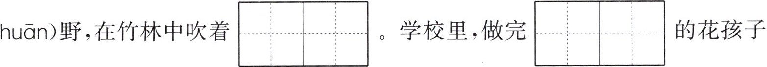 当雷云在天上$\begin{array}{|l|l|l|l|}\hline hōngxiǎng\\\hline\end{array}\\\hline $,$\begin{array}{|l|l|l|l|}\hline shīrùn\\\hline\end{array}\\\hline $的东风走过荒(huāng huān)野,在竹林中吹着$\begin{array}{|l|l|l|l|}\hline fēngdí\\\hline\end{array}\\\hline $。学校里,做完$\begin{array}{|l|l|l|l|}\hline gōngkè\\\hline\end{array}\\\hline $的花孩子们有些坐不住了。