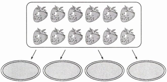 把12颗草莓平均分到4个盘子里,每个盘子里有( )颗。