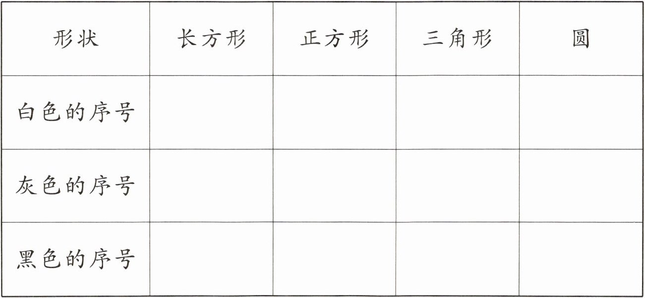 2. 对上面的分类结果,按颜色进行第二次分类,填一填。
