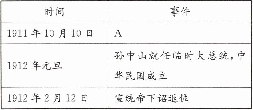 (1)材料一表格中的 A 处应为哪一事件?根据材料一,写出孙中山的主要历史功绩。