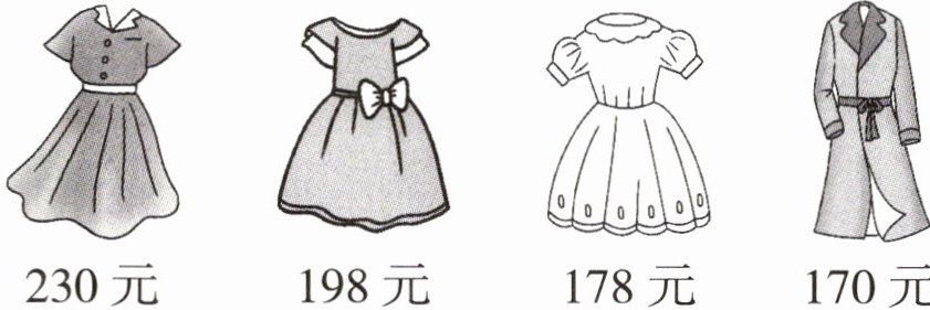 芳芳妈妈带了900元上街买衣服。她选了下面最贵的一条裙子,又配了一件风衣。买完这套衣服后,芳芳妈妈还剩多少钱?
