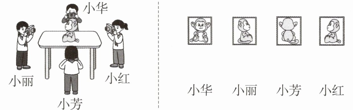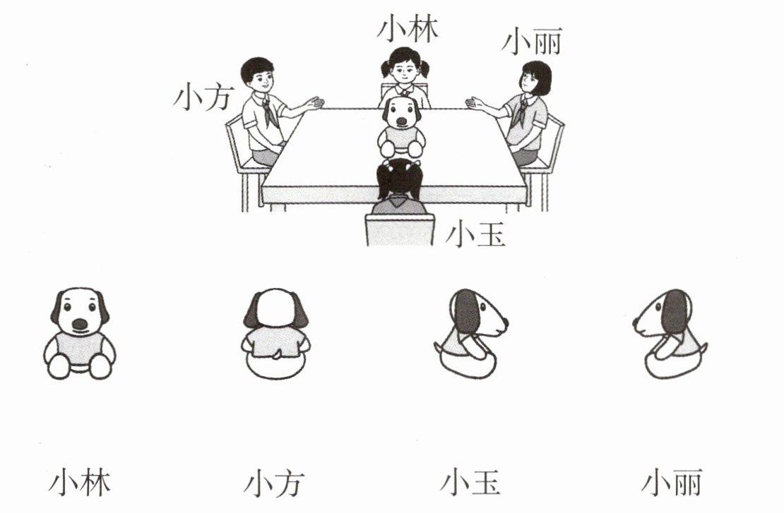 1. 四名同学从不同方向观察同一个毛绒玩具狗,他们看到的各是什么图形?连一连。