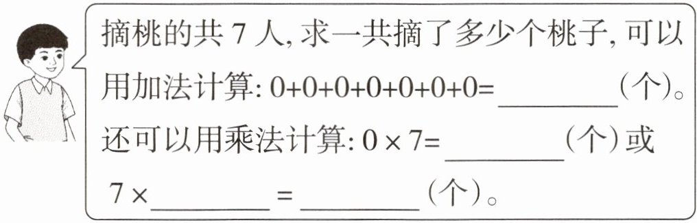 摘桃的共7人,求一共摘了多少个桃子,可以用加法计算:$0 + 0 + 0 + 0 + 0 + 0 + 0 = $