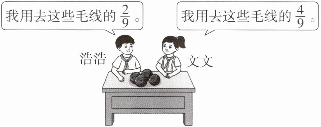 2. 实验小学举办“编织围巾,爱心敬老”活动。浩浩和文文在这次活动中一共用去这些毛线的几分之几?