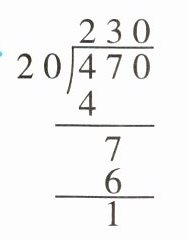 2. $\begin{array}{r} 230 \\ 20\enclose{longdiv}{470} \\ 4 \\ \hline 7 \\ 6 \\ \hline 1 \end{array} $ ( )
