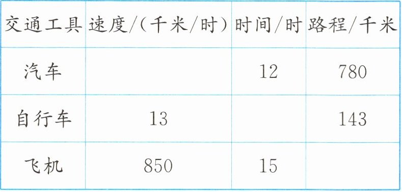 |交通工具|速度/(千米/时)|时间/时|路程/千米|