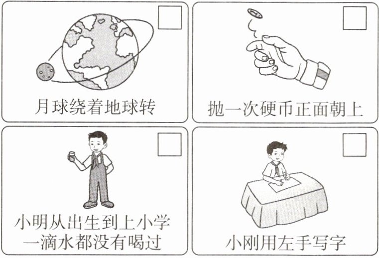 一、下面的事件,一定发生的在方框里画“√”,可能发生的在方框里画“○”,不可能发生的在方框里画“×”。