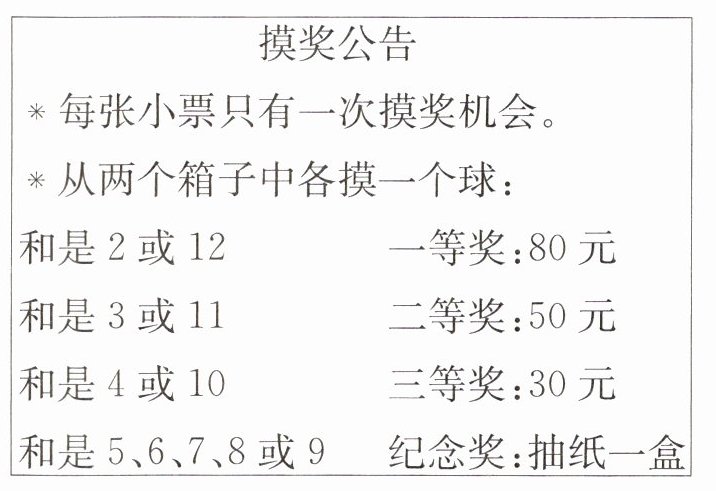 1. 纪念奖:抽纸一盒。2. 不对。因为和是 2 或 12 比和是 3 或 11 可能出现的次数少,所以摸一等奖的可能性比摸二等奖的可能性小。