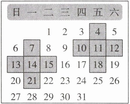 观察下图,假设月历中十字框正中间的数是$x$,总结框中数的规律,并完成下列各题。