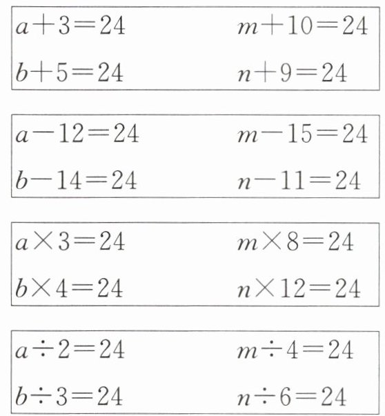 四、不计算,把每组方程中代表数值最小的字母圈出来。