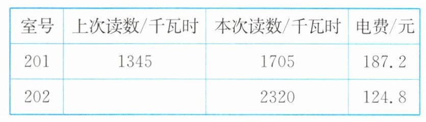 3. 1 号楼 201 室和 202 室的第一季度电费收费单(单价:0.52 元/千瓦时)如下: