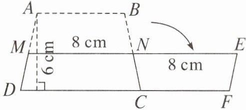 如图,$M$,$N是梯形ABCD$两腰的中点,沿着中点的连线把梯形$ABCD$分割,移补成平行四边形$MEFD$。已知$MN = NE = 8cm$,原梯形$ABCD的高是6cm$,则原梯形$ABCD$的面积是多少?