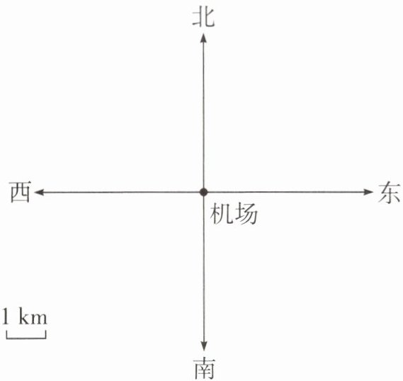 1. A飞机:从机场出发,沿东偏南30°方向画3个单位长度(1km/单位)处标注“A”。