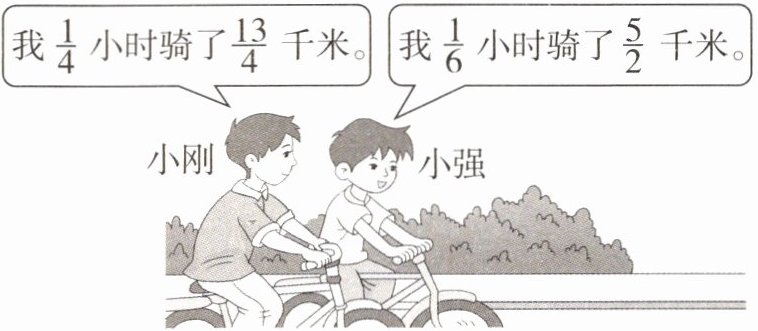 小刚的速度:$\frac{13}{4}÷\frac{1}{4}=13$(千米/时) 小强的速度:$\frac{5}{2}÷\frac{1}{6}=15$(千米/时) $13<15$ 小强骑得快。