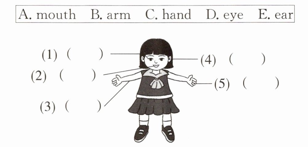 |A. mouth|B. arm|C. hand|D. eye|E. ear|