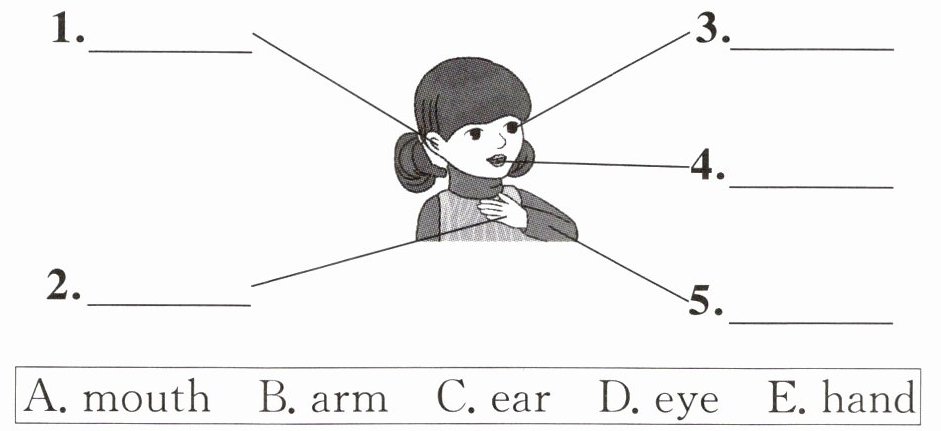 |A. mouth|B. arm|C. ear|D. eye|E. hand|