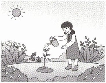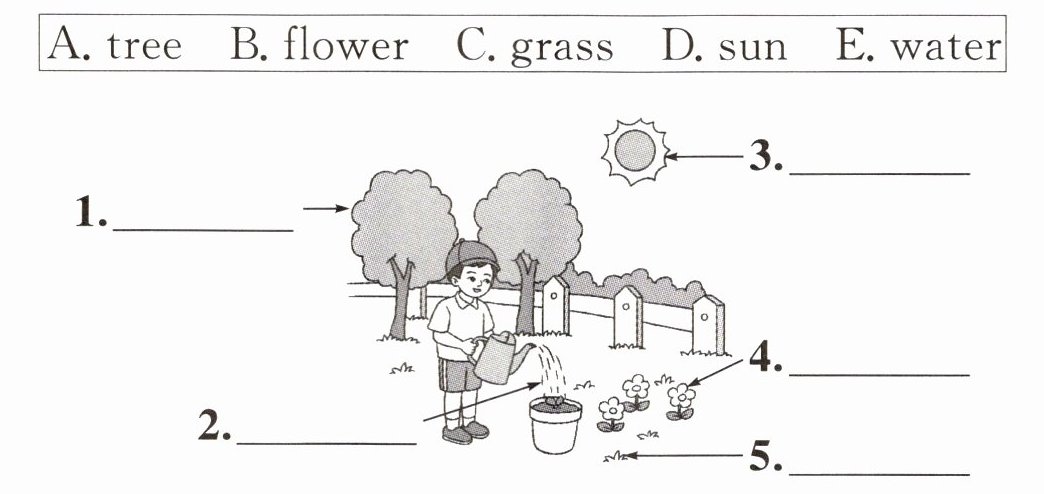 |A. tree|B. flower|C. grass|D. sun|E. water|