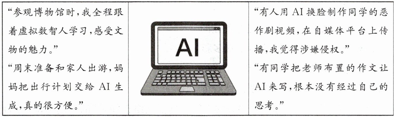 | “参观博物馆时,我全程跟着虚拟数智人学习,感受文物的魅力。”“周末准备和家人出游,妈妈把出行计划交给AI生成,真的很方便。”|[img]|“有人用AI换脸制作同学的恶作剧视频,在自媒体平台上传播,我觉得涉嫌侵权。”“有同学把老师布置的作文让AI来写,根本没有经过自己的思考。”|