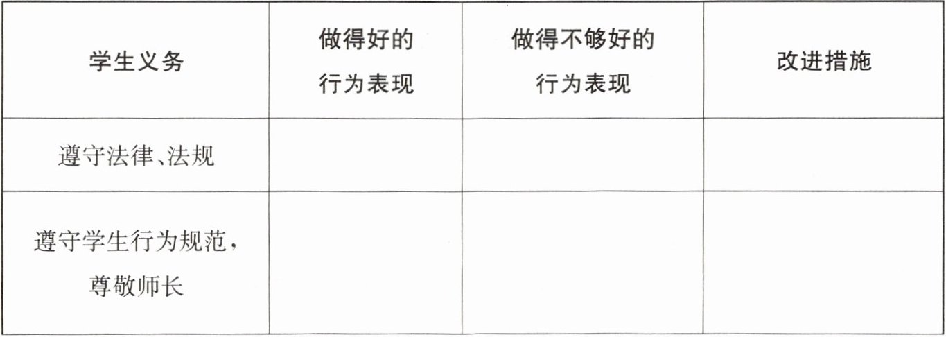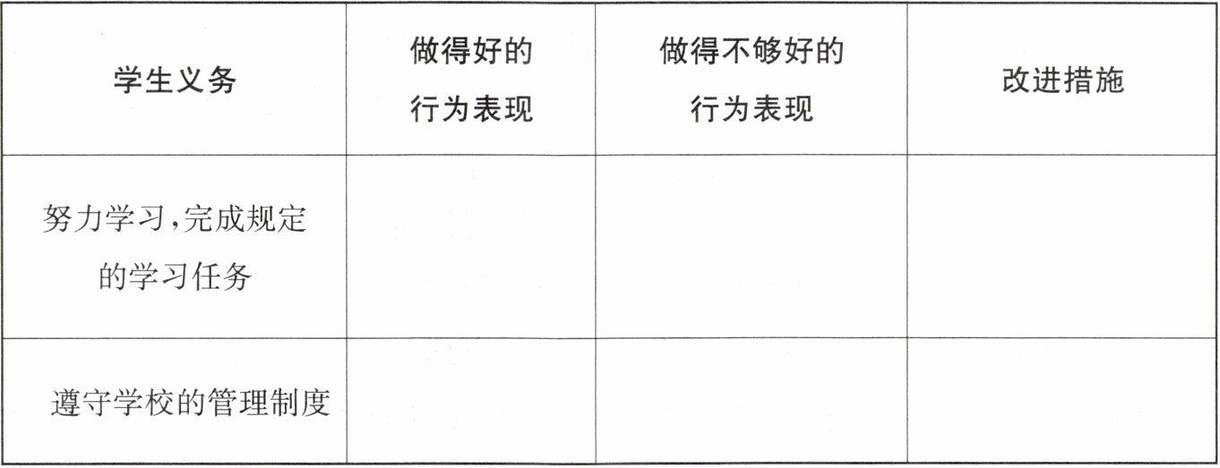 |学生义务|做得好的行为表现|做得不够好的行为表现|改进措施|