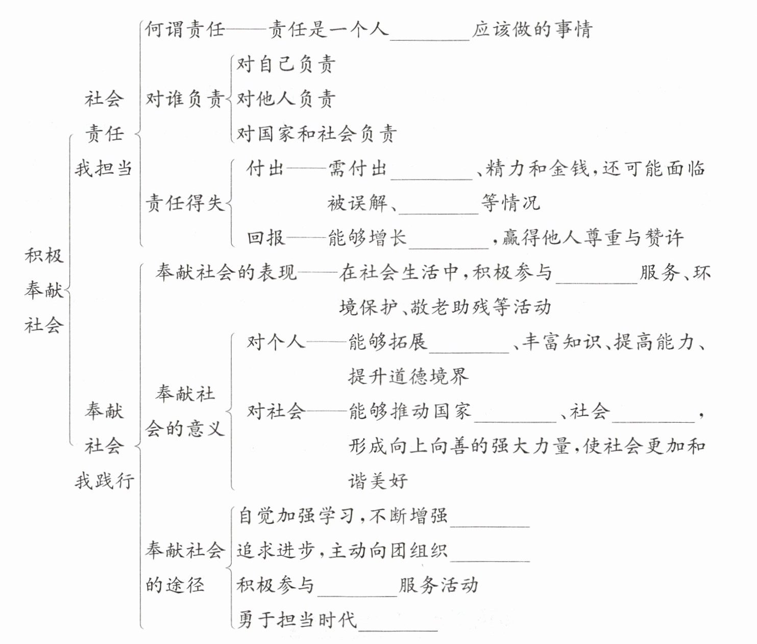 "奉献社会的表现": "在社会生活中,积极参与______服务、环境保护、敬老助残等活动",
